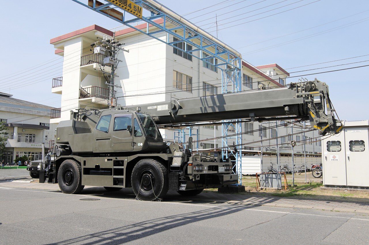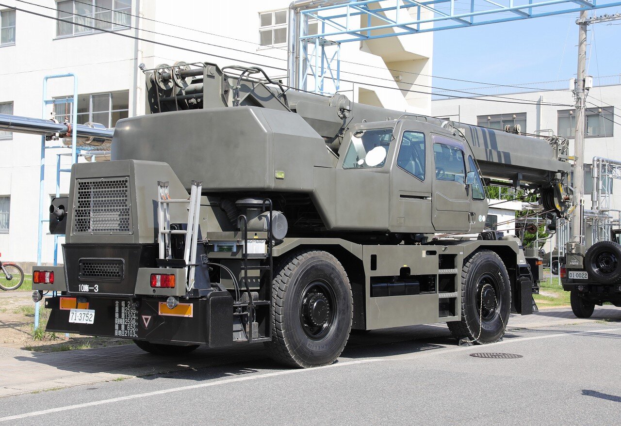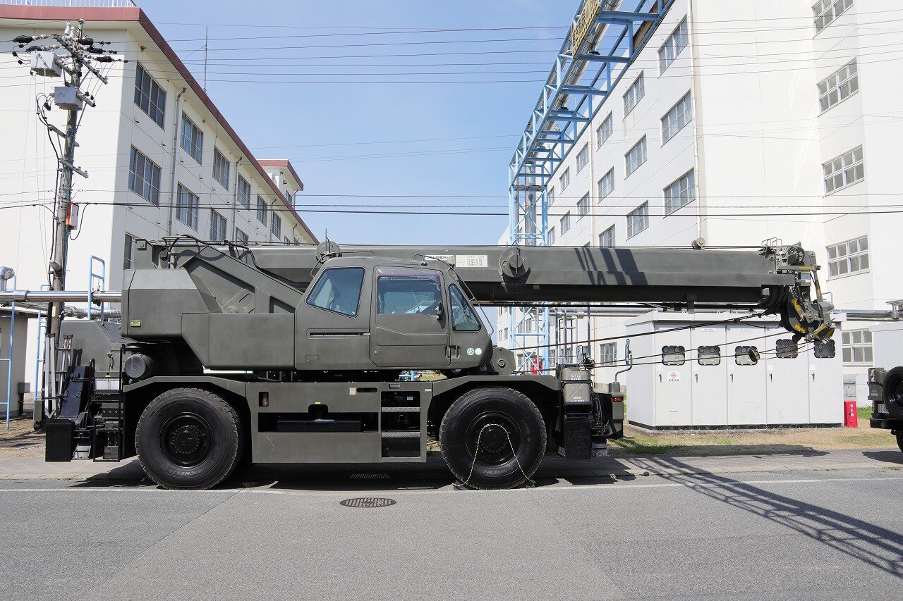 上富良野駐屯地の第3地対艦ミサイル連隊第3地対艦ミサイル中隊に配備される88式地対艦誘導弾 誘導弾運搬車。地対艦ミサイルの予備弾を運搬し、発射機搭載車へ装填します。7tトラックに2.9t吊りのクレーンを装備しており、ミサイルはキャニスターごと装填します。重量の関係で6発を一気に装填することはできず、上下2発ずつを3回に分けて装填します。荷台後部にクレーンの支持架がありますが、装填作業時にはクレーンの支障となるため、取り外して地面に寝かせておきます。