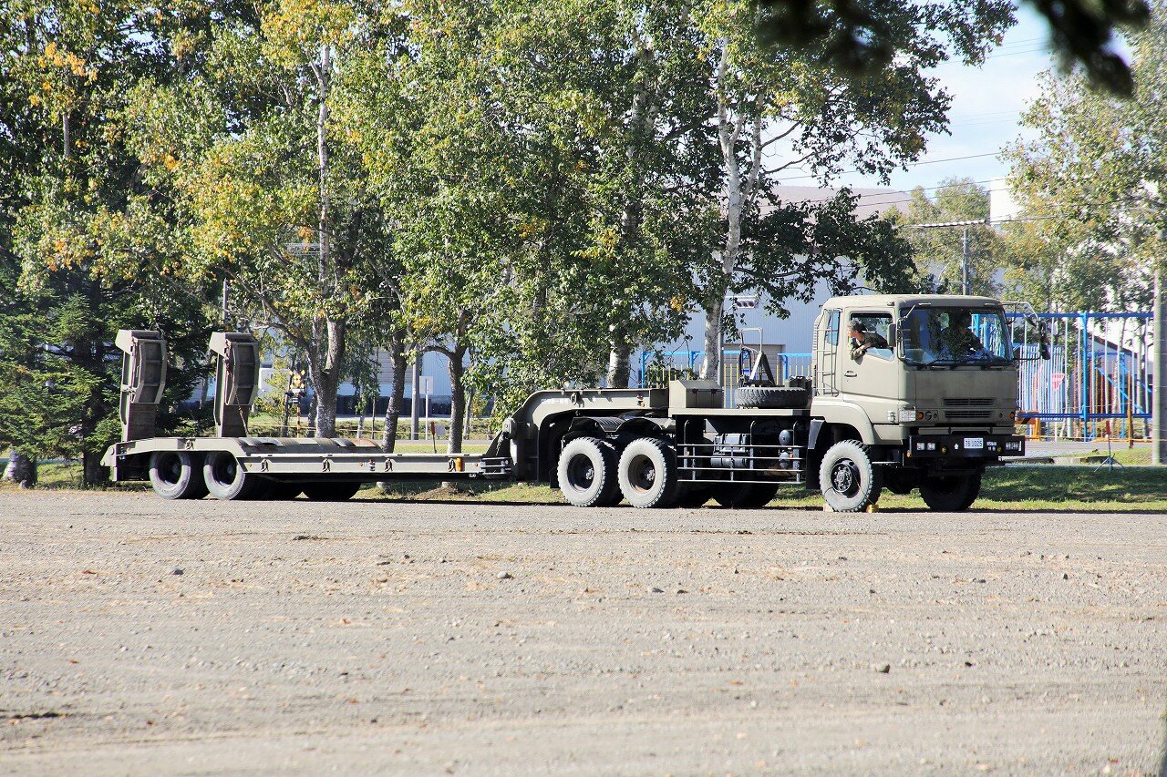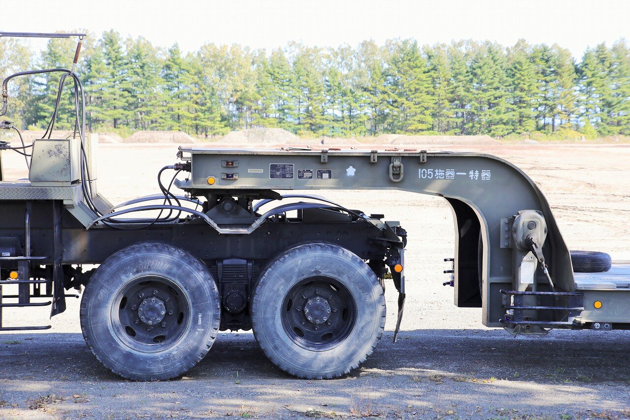 南恵庭駐屯地の第105施設器材隊特殊器材中隊に配備される中型セミトレーラ2型Bタイプ。中型セミトレーラ2型は最大積載量30100kg以下で荷台中央部分が一段低くなる中低床式のトレーラーで、全幅3.17~3.20mと幅広のAタイプ、全幅2.97~3.00mのBタイプに分かれています。