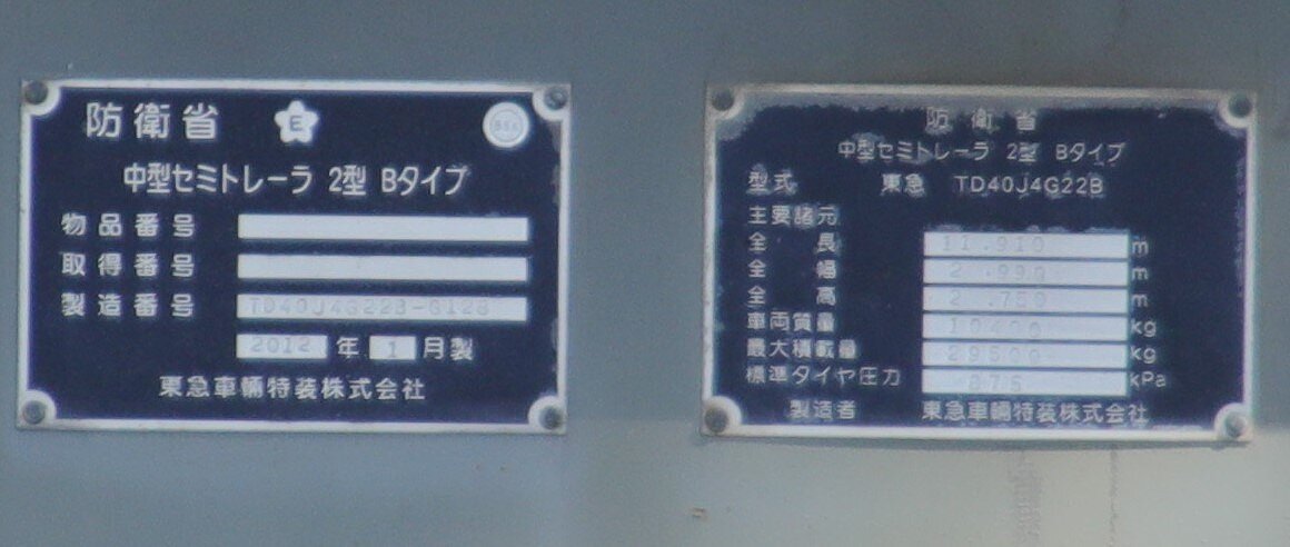 本車両は東急車両のTD型中低床式セミトレーラ、型式は「TD40J4G22B」。全長11910mm、全幅2990mm、最大積載量29500kg、車両総重量38880kg、2012年1月の製造車両。荷台後部に手動折畳み式のローディングランプを装備します。牽引車は7tトラックベースの2デフヘッドで「中型セミトレーラーけん引車」の名称で調達されています。