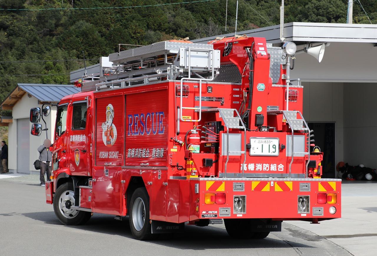 平成23年度(2012年3月)に導入された救助工作車Ⅱ型。須崎消防署に配備されています。モリタ架装で収納庫は2枚タイプ。屋根の上にルーフステージを設置。ウインチは大橋機産製(5t引き)。クレーンはタダノ製2.93t吊り。屋根左側のチタン製三連梯子の上には舟形担架を積載。クレーン前方に伸縮式照明。右側の大型道具箱の上にもストッパーを付けて舟形担架を2個積載しており、確認できるだけで3個積載しています。