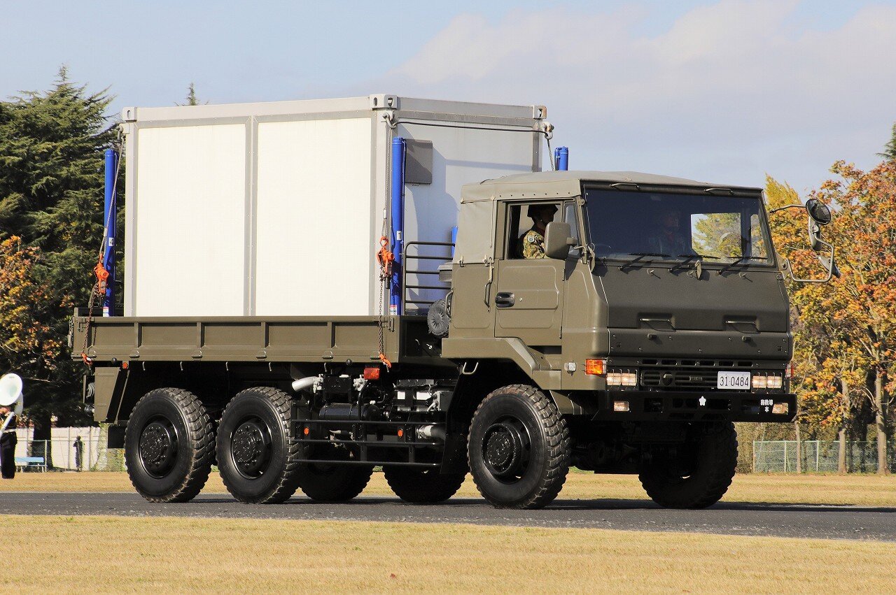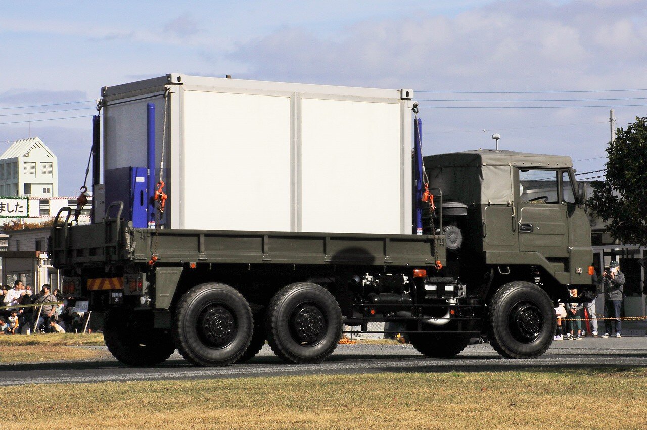 コンテナにジャッキと発電機・外部電源供給ユニットが一体化され、現場でコンテナを車両から積載/降下させることが可能です。コンテナ内部には資機材固定用のラッシングレールが2段、天井には吊り下げ用のハンガーレールを4本設置。コンテナ上部四隅には金具が取り付けらられ、クレーンでの吊り下げも可能です。Ⅱ型と合わせて全国各駐屯地に1台ずつ配備されています。
