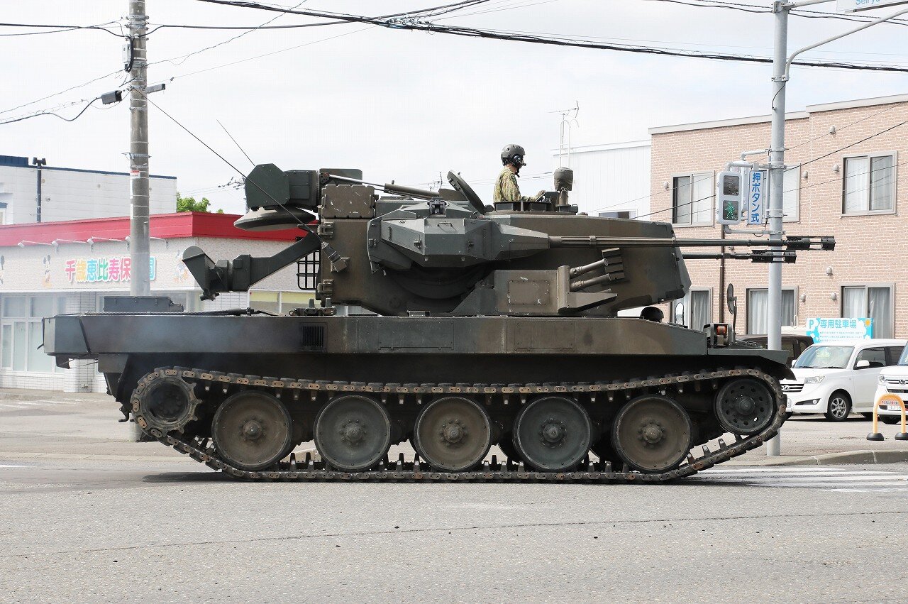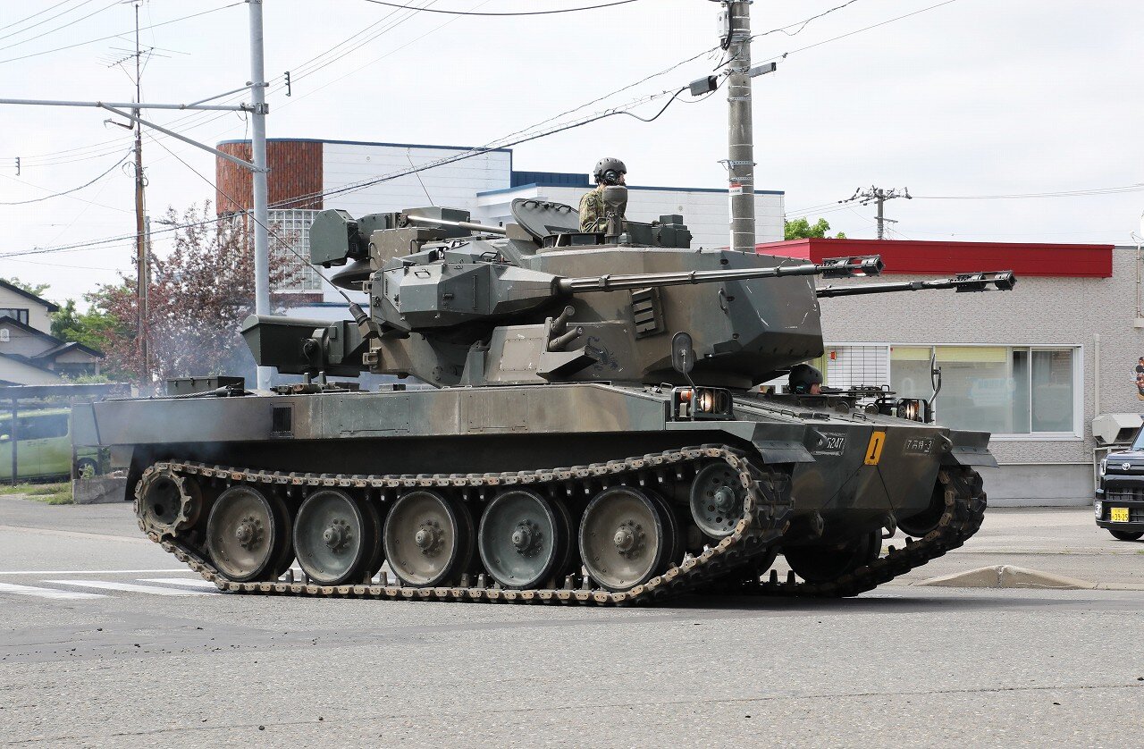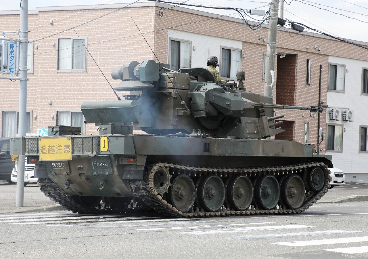 74式戦車の車体をベースに対空砲塔を搭載し、乗員は3名。エリコン35mm対空機関砲KDAを2門装備し、片側ずつの射撃も可能です。砲塔後部に索敵レーダーと追尾レーダーを装備するほか、バックアップ用に映像システム・低光度TVカメラ・赤外線画像装置・レーザー距離計が装備されており、夜間の電波妨害下での行動が可能です。