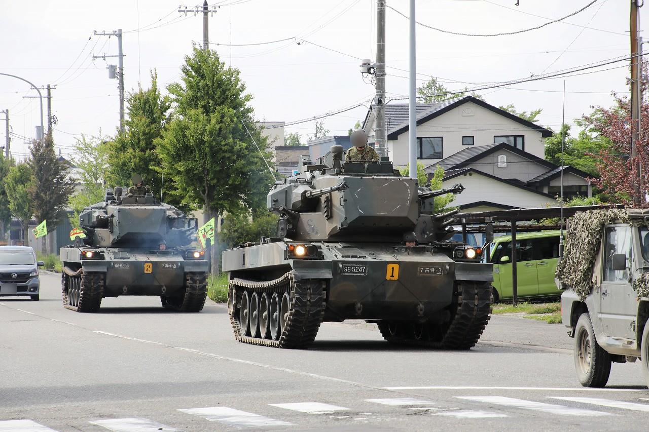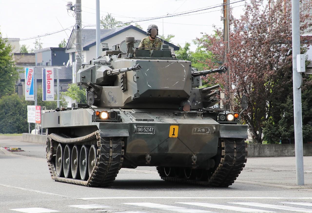 東千歳駐屯地の第7高射特科連隊第3高射中隊に配備される87式自走高射機関砲(87AW)。機甲部隊の対空援護用として1987年に制式化。1987年~2002年までに52両が調達され、第7高射特科連隊(4個中隊32両)+第2高射特科大隊第3高射中隊(8両)+高射教導隊(8両)+武器学校にそれぞれ配備されました。各高射中隊は2個小隊8両で構成されています。