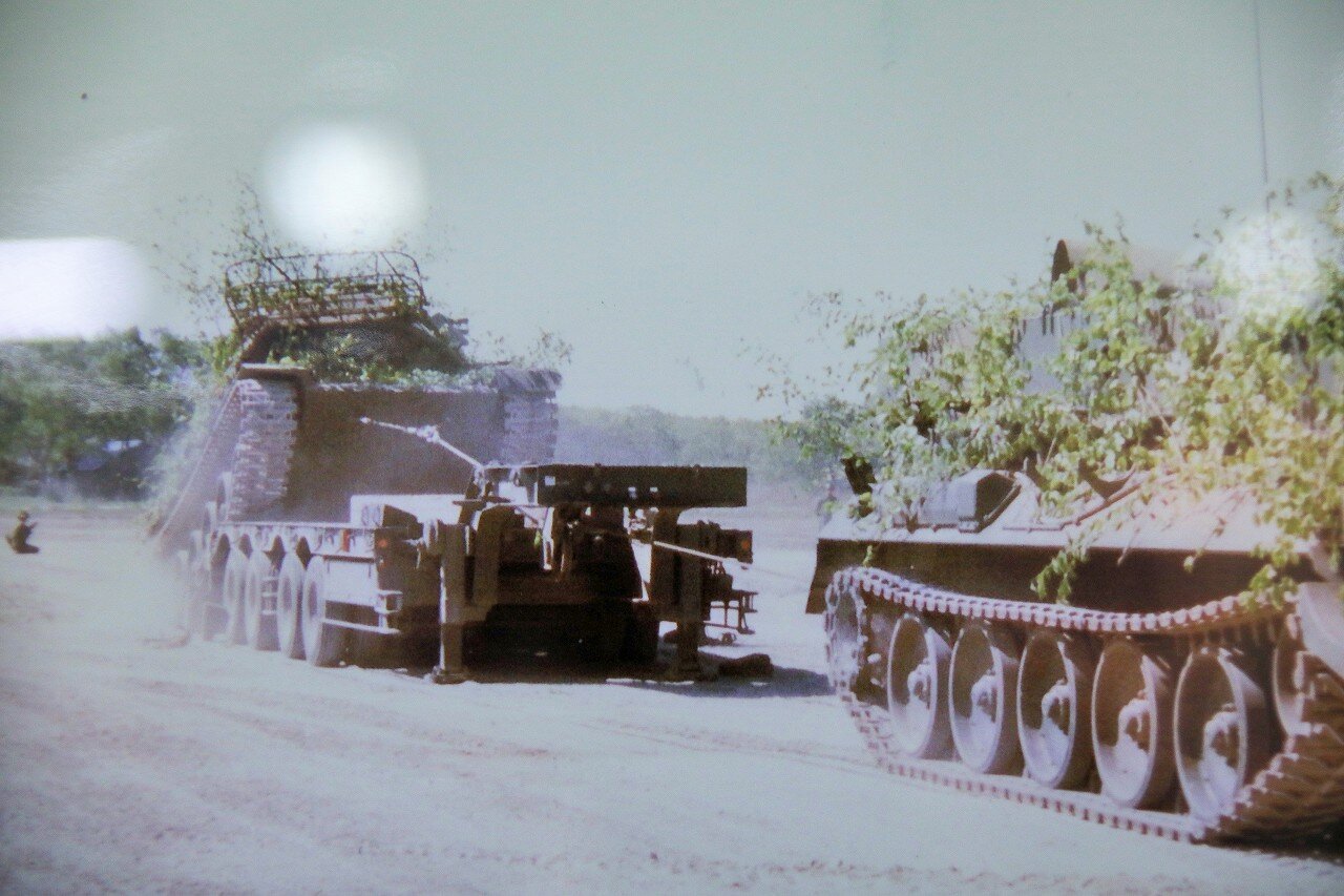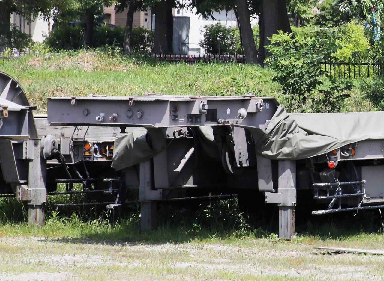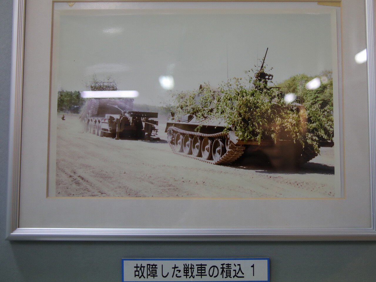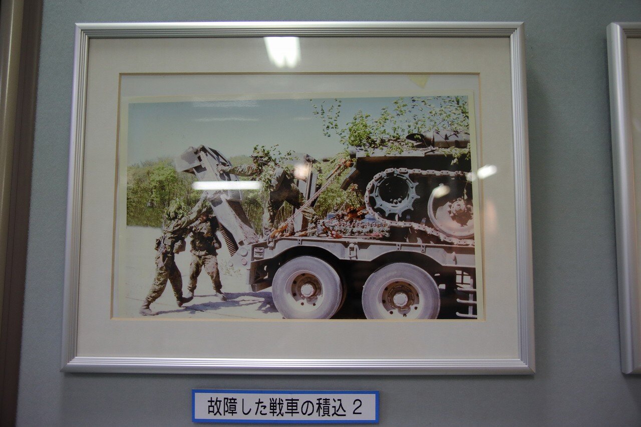 島松駐屯地の史料館の展示より。自走不能となった74式戦車(74TK)を78式戦車回収車(78TKR)が牽引し、特大型運搬車へ積み込む様子が写されています。戦車のような重車両はクレーンでトレーラへ積載することが難しいため、写真のように牽引して積み込みます。牽引に備えて特大型運搬車のグースネックにはワイヤーロープを通すリールが装備されています。