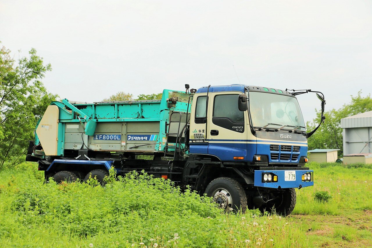 JA清里町が所有し、斜里通運が運行を受託するマニアスプレッダー。堆肥運搬から圃場散布を行う車両で、販売は農業系特殊車両を得意とする東北海道いすゞ自動車環境事業部、架装は極東開発工業子会社の振興自動車が担当しています。