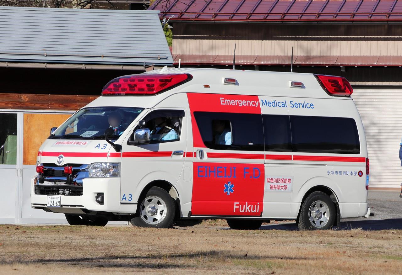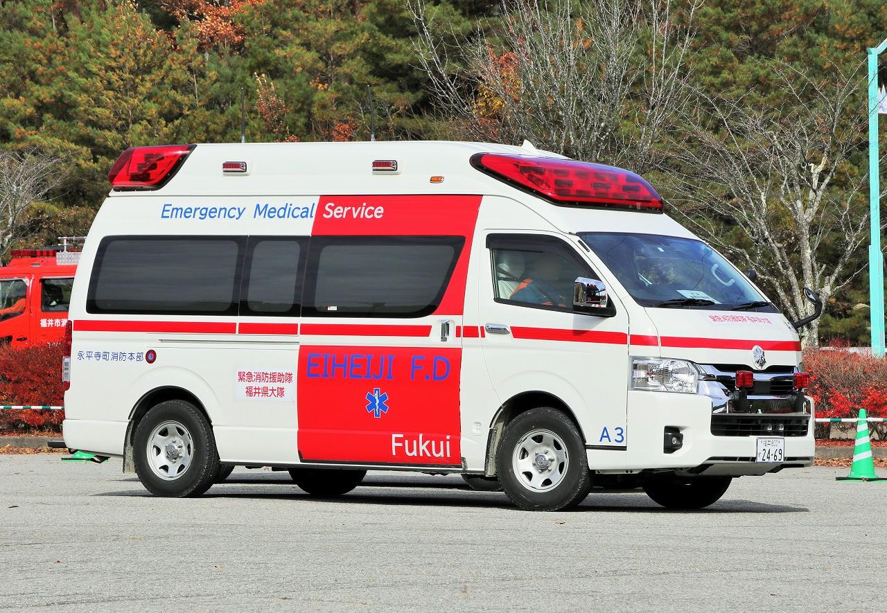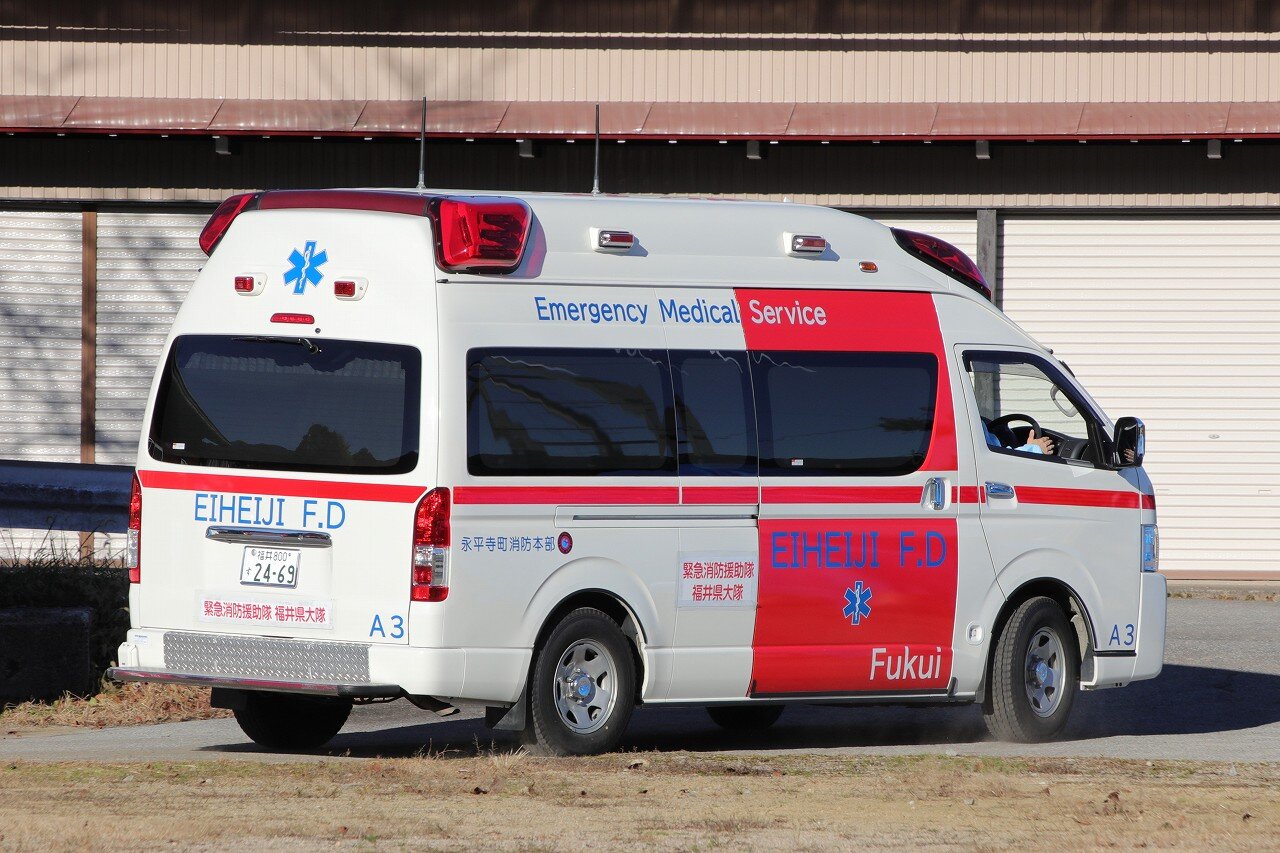 令和5年度(2023年12月)に導入された高規格型救急車。消防署(本署)に配備されています。作業灯やヘリ誘導用のLED警光灯はありませんが、側面とバックドアに補助警光灯を装備します。特徴は赤色に塗られた左右のスライドドア。これは緊急消防援助隊登録車両として全国の災害現場へ派遣された際に、救急車が助けに来たと一目で分かるようにすることで被災地の皆さんを勇気づけられるようにという意図があるからです。