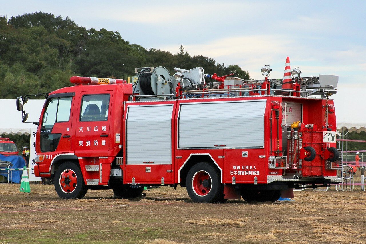 キャブ上にはルーフステージ、屋根左側に三連梯子、右側に道具箱、後部には伸縮式照明装置を装備します。西消防署の主力車として運用されており、この日は緊急消防援助隊の訓練に参加しました。