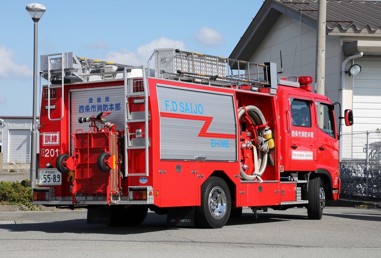 平成22年度(2010年12月)に導入された水槽付きポンプ車Ⅱ型。西消防署に配備されています。架装はモリタ。2000L水槽にA-2級ポンプを搭載したⅡ型で、西条では東と西の2台のみ配備されています。収納庫はハーフシャッタータイプで後部は収納庫、ホースカーはリアバンパーに立てた状態で搭載されています。