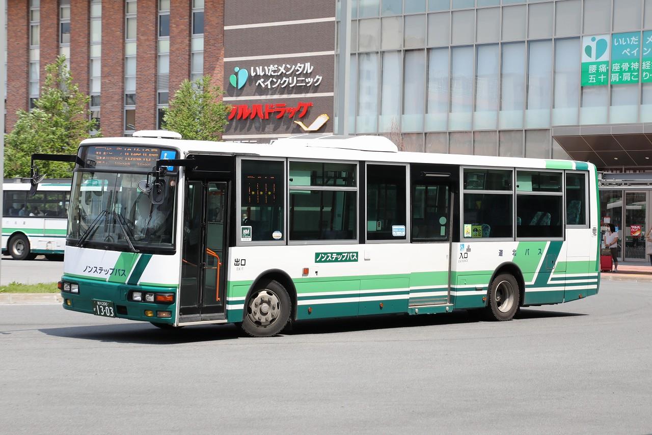 2024年05月09日 道北バス(路線車) 1303号車 永山出張所に所属する2006年式のエアロミディ10.5m。元東急バス「T7711」で、2021年10月に運用を開始しました。エアロミディ10.5mは2005年式3台、2006年式3台の計6台が在籍しており、いずれも東急からの移籍です。車内は東急時代のままで、側面方向幕の位置もそのままで運用されています。旭川200か1303 PA-MK27FM(2006年式)2022年7月 旭川駅前バスターミナルにて