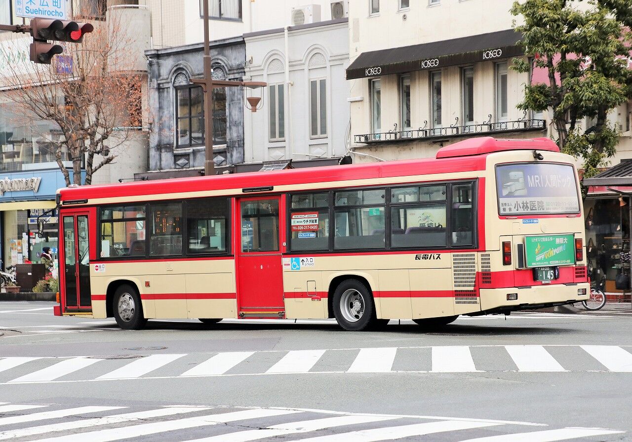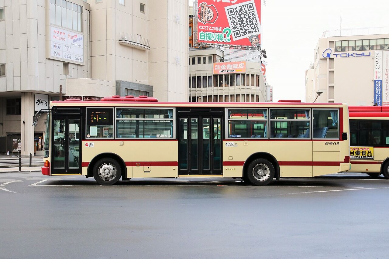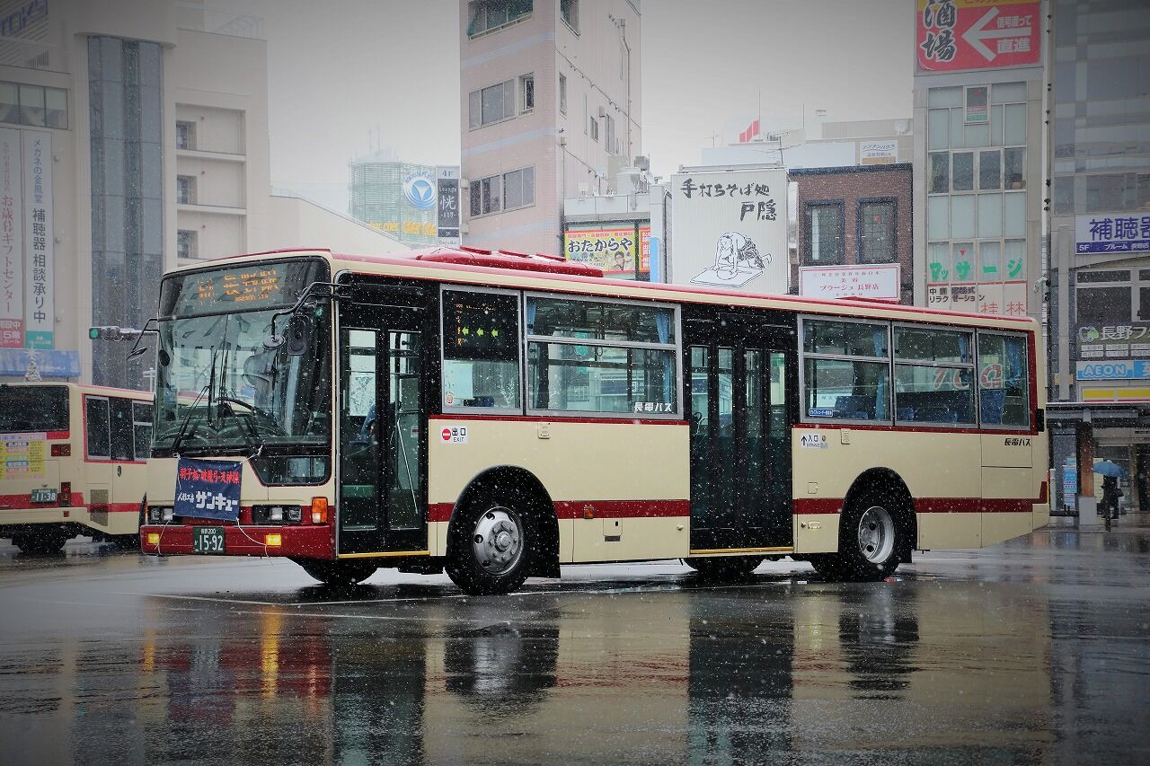 2021年01月20日 長電バス(路線車) 1592号車 2017年6月に運用を開始した元相鉄のワンステ。長野営業所に所属しています。相鉄時代の車番は「1253」で、旭営業所で活躍しました。車内は相鉄時代から変わりません。2年ほど前にラッピングが解除されましたが、その名残りで中扉直前のガラスに社名が残されているのが特徴です。長野200か1592 KL-MP35JM(2002年式)2020年12月 長野駅前にて
