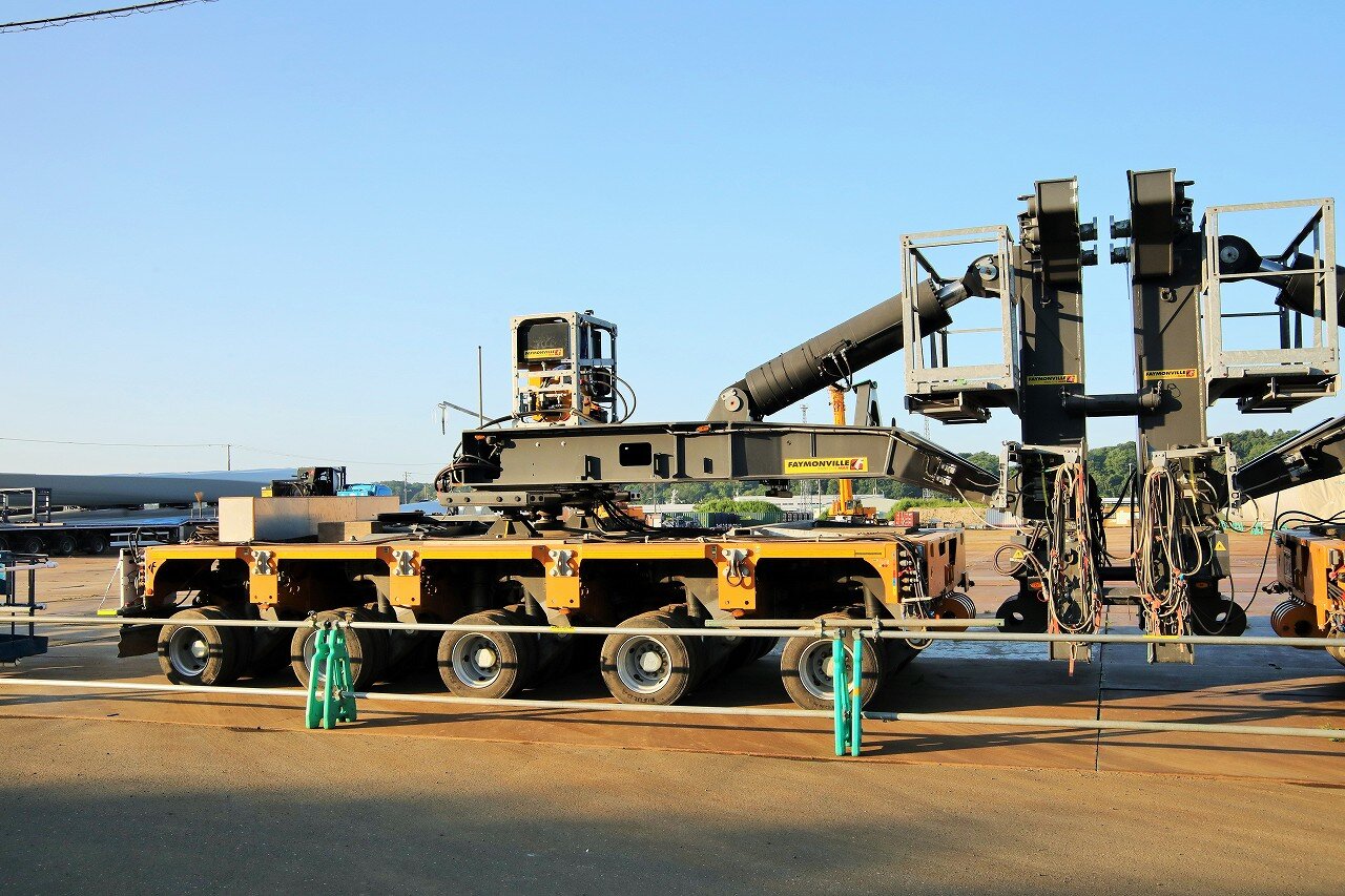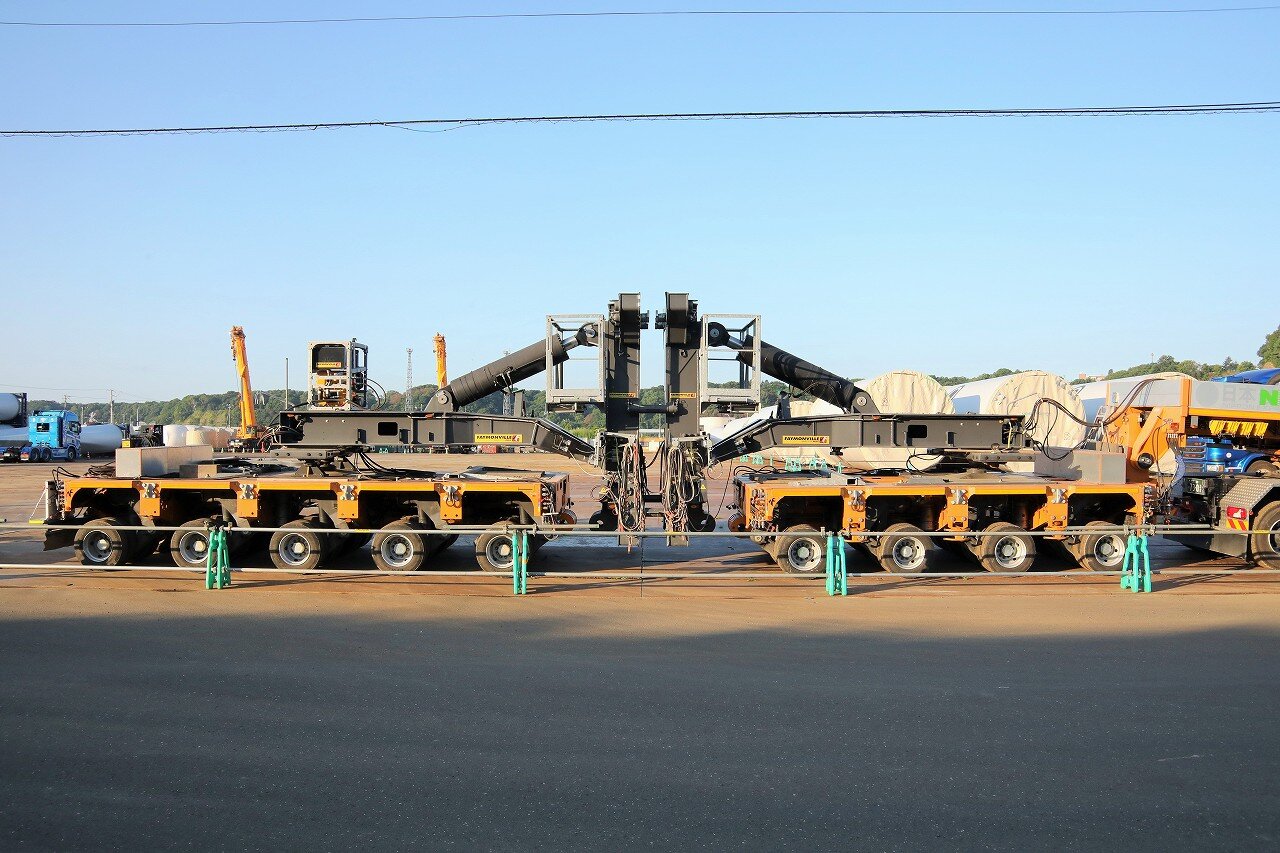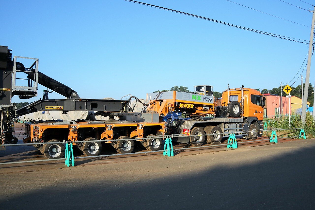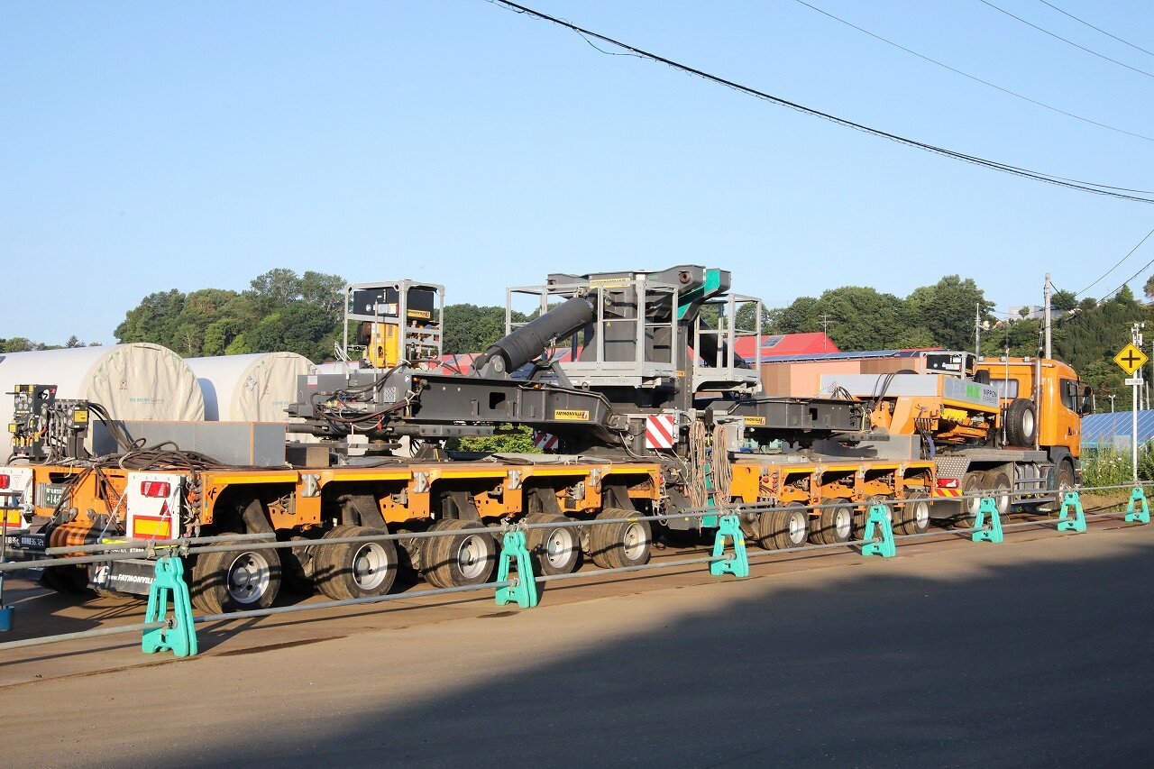 2023年7~9月の予定で、北見市常呂と網走市能取地区に建設される風力発電用の部材を網走港から輸送しています。風力発電機は主にボトムタワー・ブレード・ナセルで構成されており、本車両は長さ13.5m、直径4.6m、重量75tのボトムタワーを運んでいます。ボトムタワーを挟み込み高さを抑えることで釧網本線の高架橋(高さ4.8m)をクリアすることができます。網走市大曲には石北本線と国道を超える橋がありますが、長い台車で荷重を前後に分散することで、荷重の1点集中を抑えることができます。この日はお盆休みとあって、網走港で留置されていました。