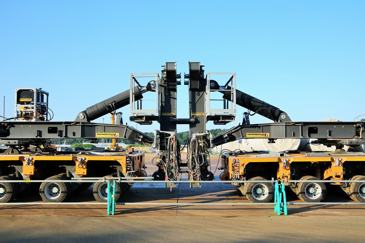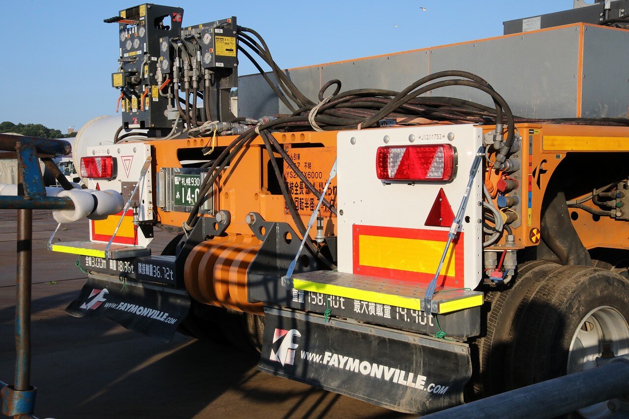 北海道重機建設支店に所属するスカニアR730+フェイモンビルトレーラー。台車は荷物を前後で挟み込んで運ぶ「シュナーベルタイプ」で、イタリアのフェイモンビル社製です。台車の最大積載量は58.5tで、前後合わせると117tという凄まじい積載量を誇ります。荷物は上2ヶ所、下2ヶ所の4ヶ所で固定し、固定部分には荷物が道路上の構造物へ接触しないことを確認する作業員用のカゴが付いています。トラクタはスカニアR730、6×6の総輪駆動車です。