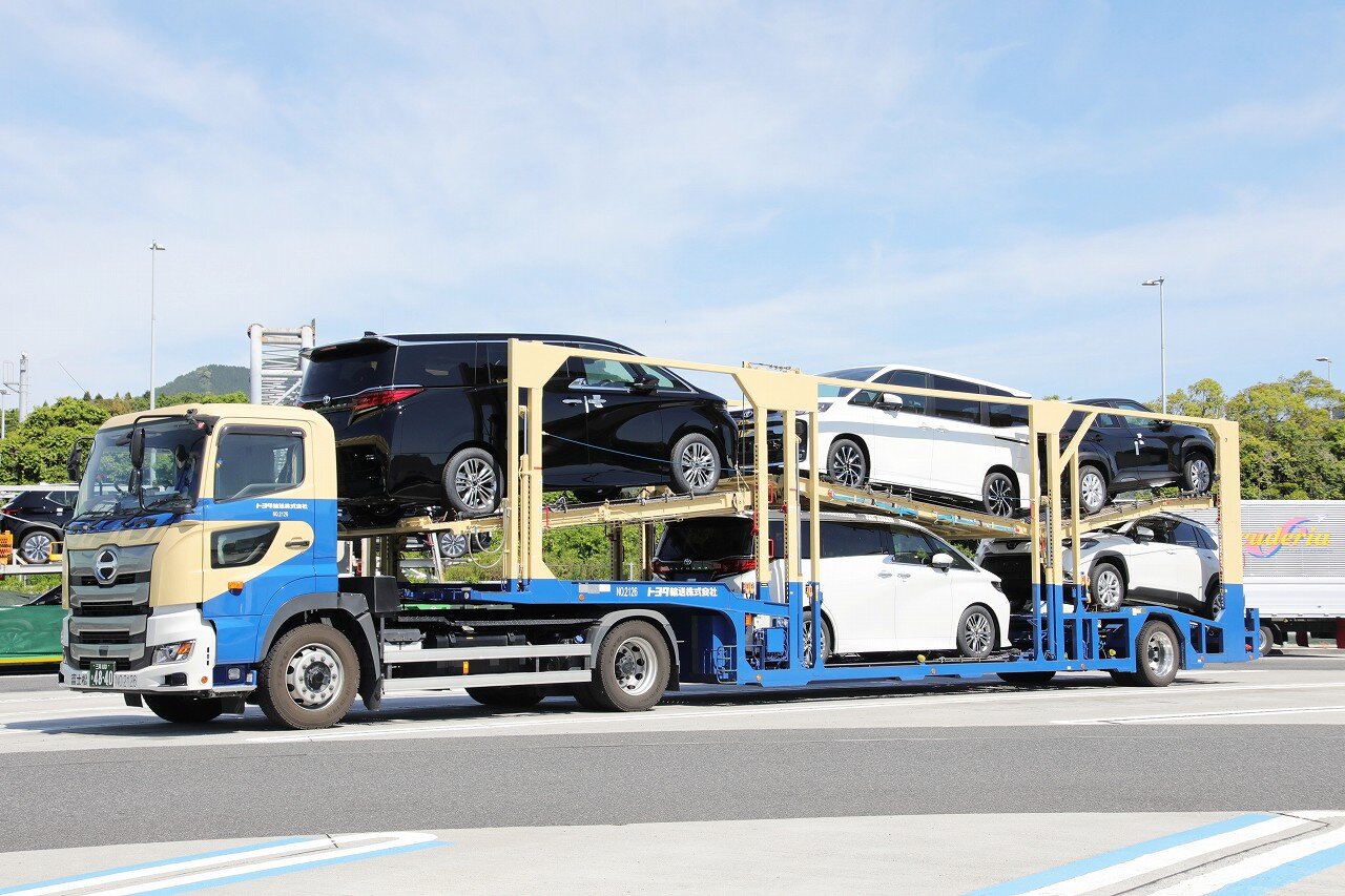 富士松営業所に所属するプロフィア+浜名ワークスHST157RPG。連結全長17mの6台積みトレーラーで、1軸ダブルタイヤの採用により下段最後尾の6番フロアに3ナンバー車を搭載することが可能です。エンジンを掛けずにフロア昇降操作可能な油圧発生装置を採用しており、燃費と騒音に配慮されています。