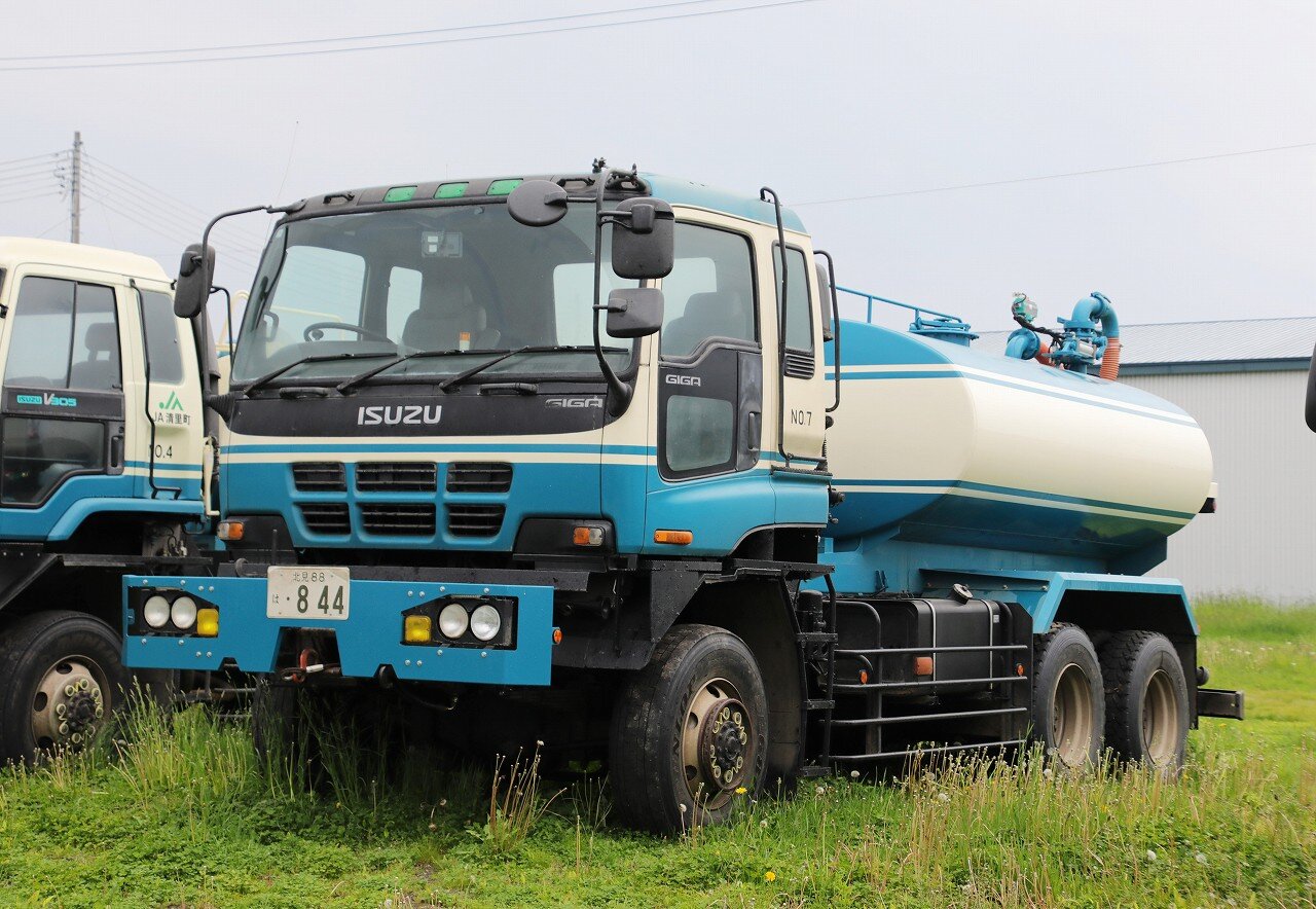 スラリーポンプにより毎分1500~3800Lの散布が可能。散布幅は8~15mで、8.6トンの液肥を約3分で散布可能です。軟弱圃場へ直接乗り入れて散布することから、ギガの総輪駆動車(6×6)を採用。前バンパーには救助用にウインチを装備しています。フロントグリルが6分割であること、分類番号が2桁であることから1997~99年頃の導入と思われます。
