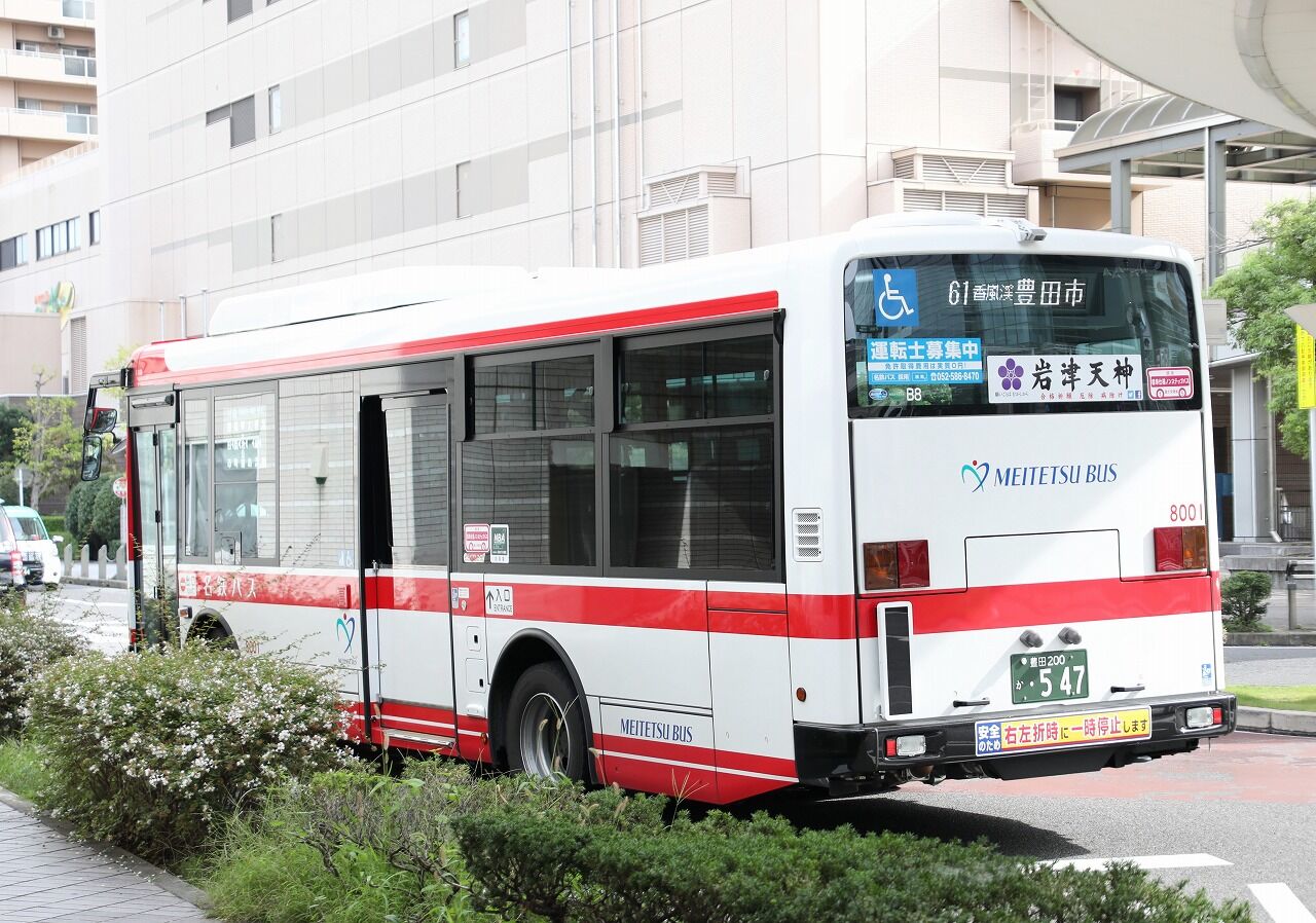 2021年10月29日 名鉄バス(路線車) 8001 2021年1月に導入された豊田営業所のレインボー。前年は名鉄カラーだけで9台が導入されましたが、今回は1台のみとなりました。ただし、おいでんバスには8011・8012・8013が導入されています。仕様は前年を踏襲しているようで、車内は座席定員28名の郊外Ⅱ型です。豊田200か547 車番8001 2KG-KR290J4(2020年式)2021年9月 豊田市駅にて