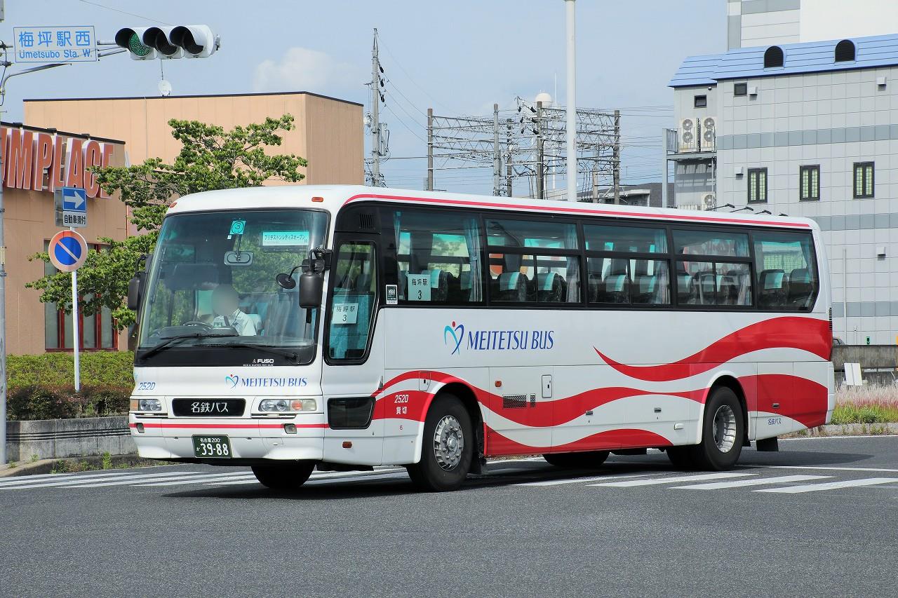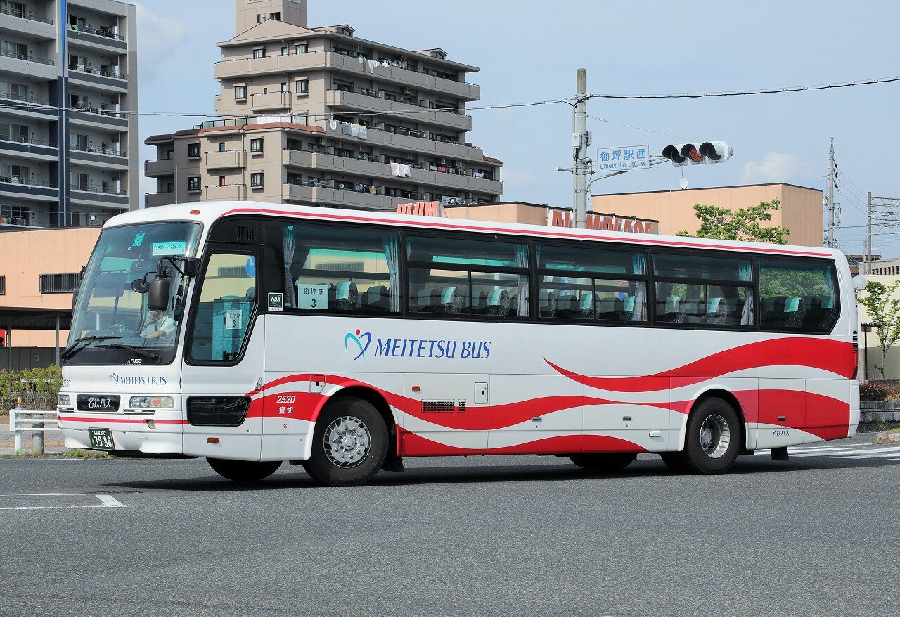 2025年01月10日 名鉄バス(貸切車) 2520号車 2005年1月に導入されたエアロバス。豊田営業所に所属しています。この年15台が導入された貸切車で、車内は補助席付き(11席)12列シート、定員60名仕様。新製配置の小牧から始まり、名古屋→岡崎→一宮→津島→名古屋を経て、2024年夏に豊田へ転属しています。豊田では平日の特定輸送で活躍しています。名古屋200か3988 2520 KL-MS86MP(2005年式)2023年5月 梅坪駅前にて