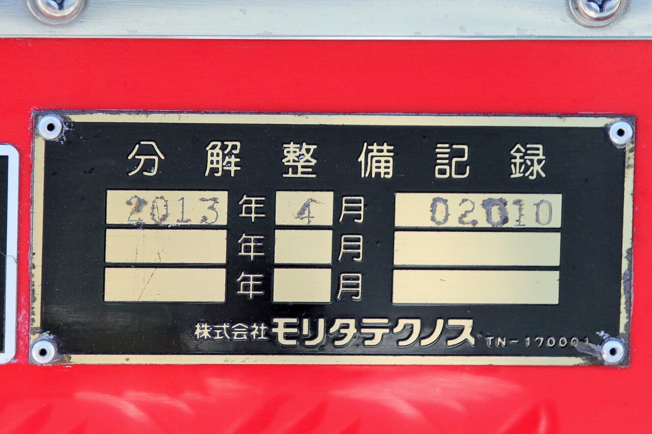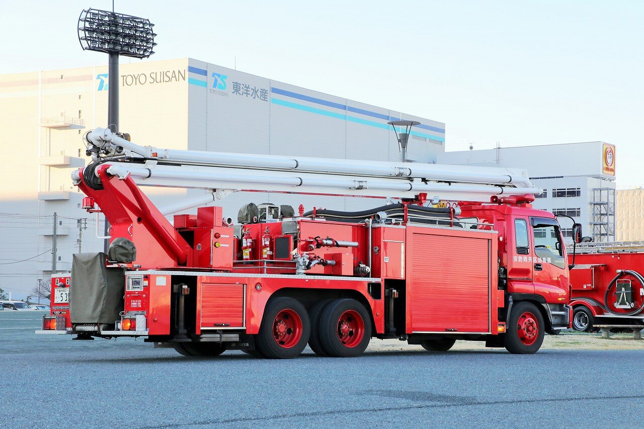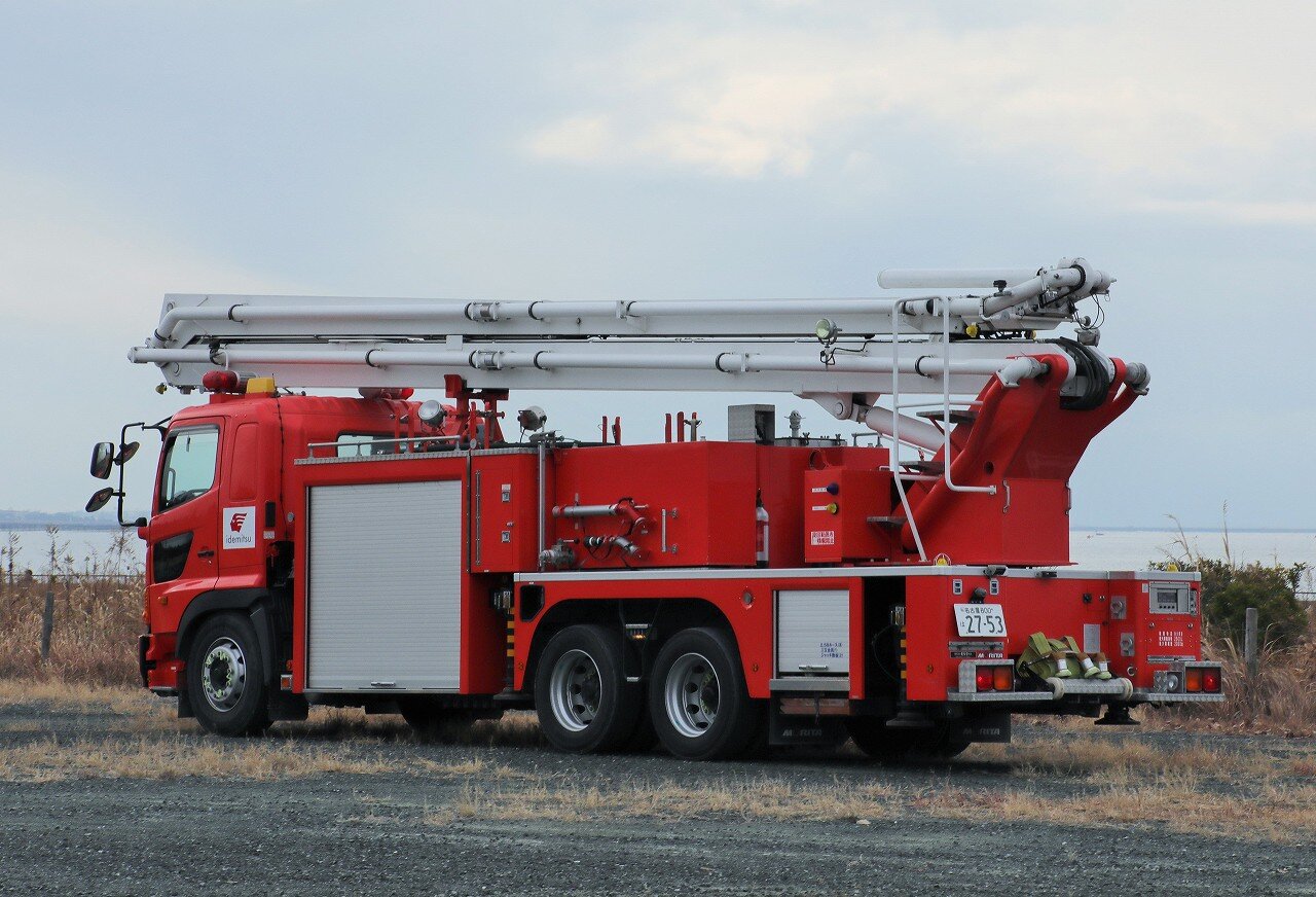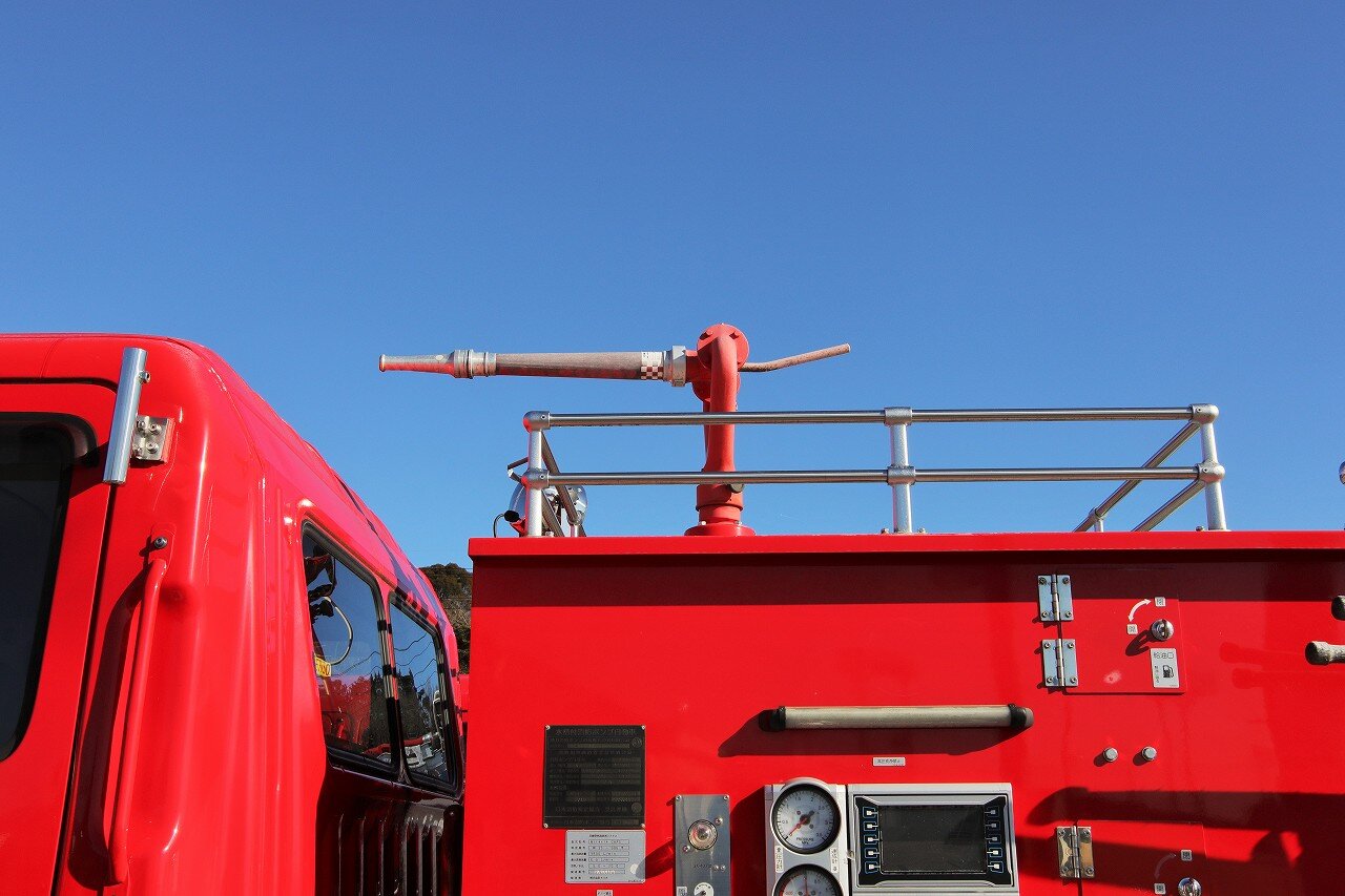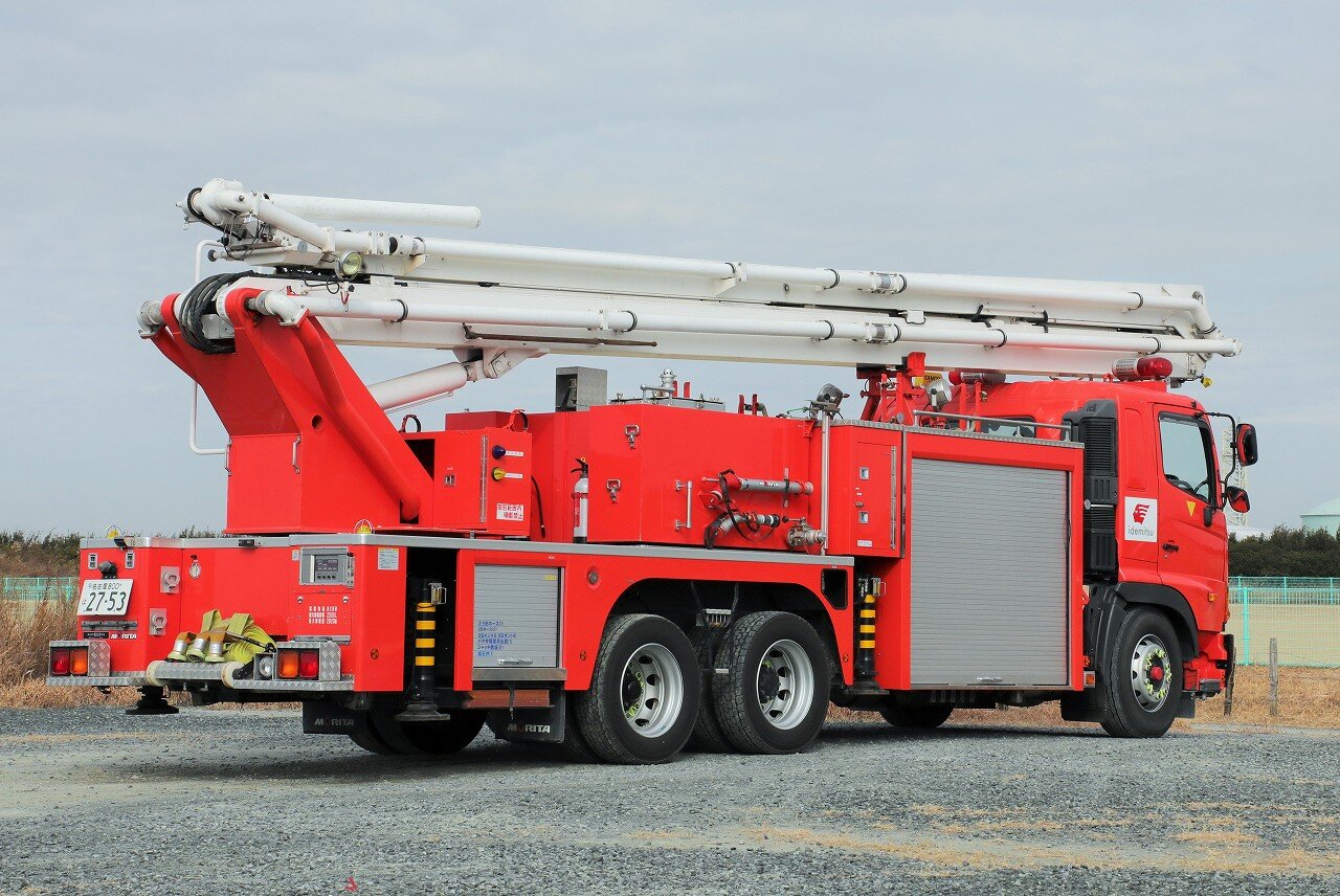 架装はモリタ。ブームは最大27mの高さまで伸ばす事が可能な2節屈折式で、日本ドライケミカルのOEM品を使用しています。ポンプは強力なA-1級で、最大射程距離70m。2000Lの消火薬液と薬液混合装置を装備することで、化学車の役目も担います。薬液室側面にはYONE製低反動泡ノズル・低反動水ノズルを搭載しています。