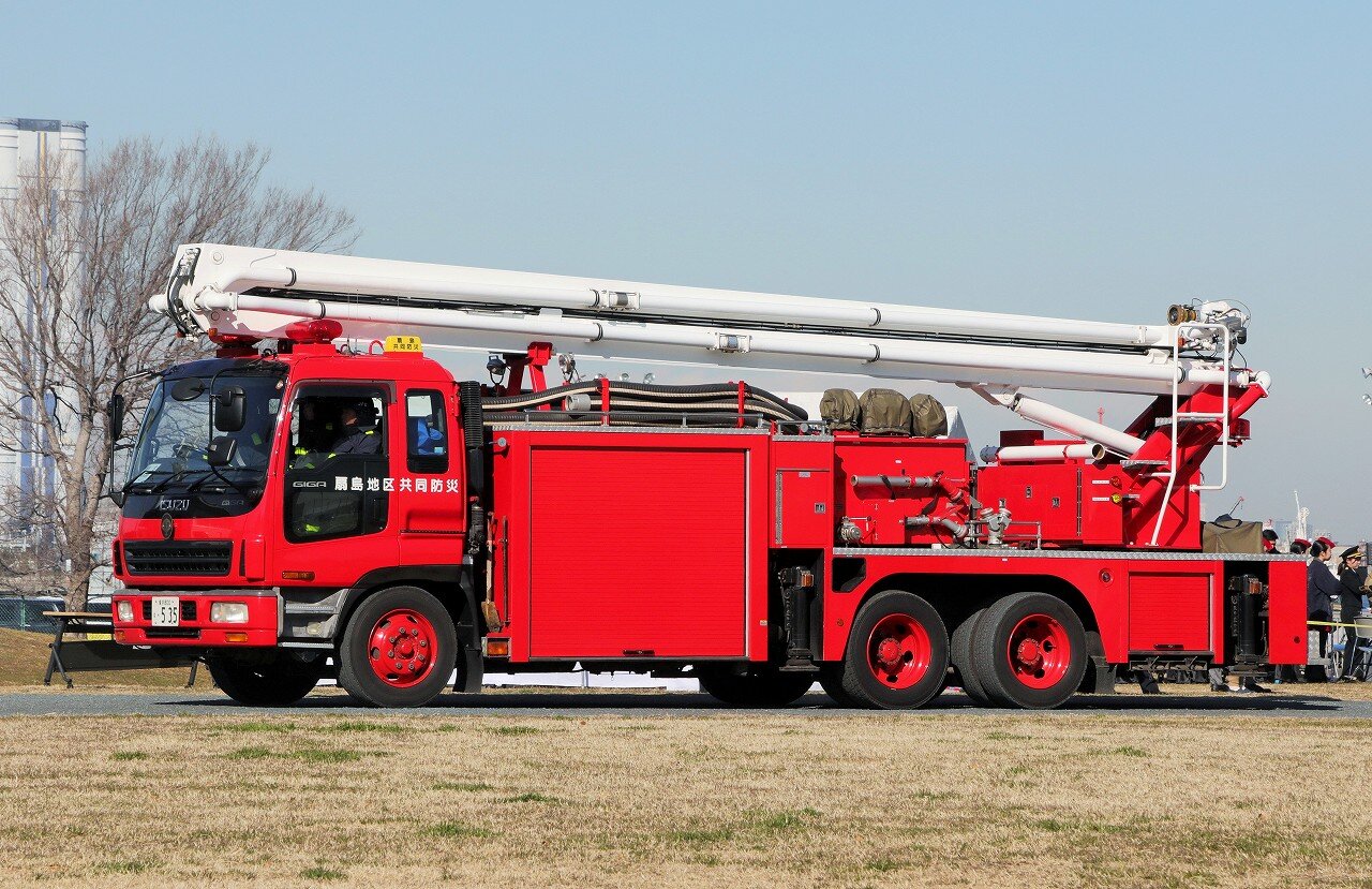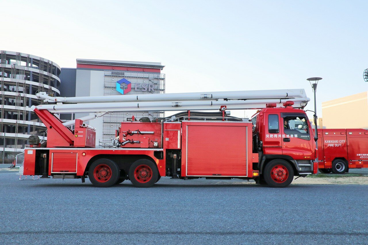 平成16年度(2004年12月)に導入された大型化学高所放水車。JFEスチール東日本製鉄所・東亜石油水江製油所・出光興産川崎事業所(扇島地区)・東京ガス扇島LNG基地・扇島パワーステーションの5事業所により運営される扇島地区共同防災隊に配備されています。JFEスチール扇島保安センター内に基地を構え、大型化学高所放水車と泡原液搬送車を運用しています。